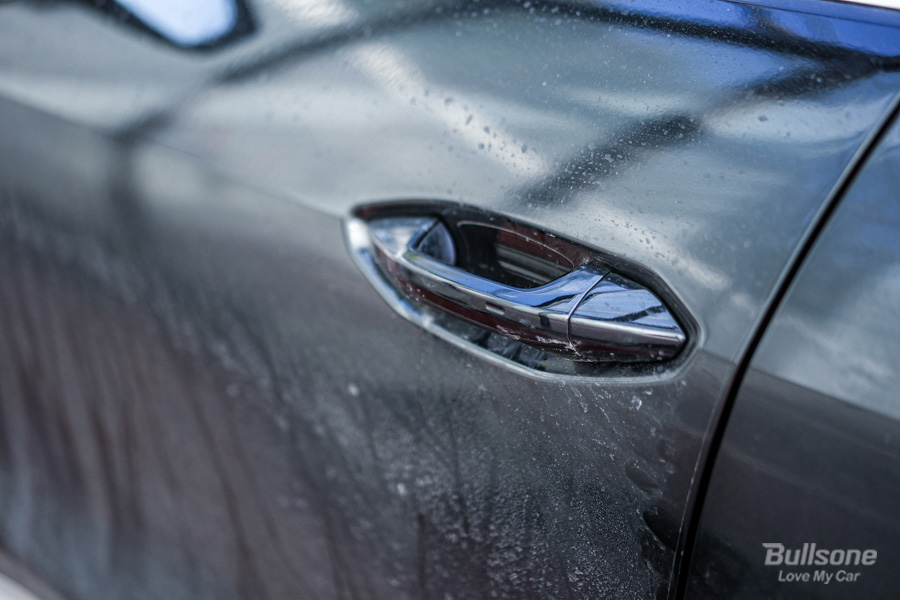이대로 세차를 끝내면 안 됩니다. 타월로 물기가 제거된 후 차가 조금 마르게 되면 다시 물 때가 이렇게 올라오는데요. 멀리서 보기에는 차가 깨끗해 보이지만 조금만 가까이 가도 이렇게 다시 지저분해지는 모습을 볼 수 있습니다. 흰색 차에서는 크게 티가 안 나는데, 검은색 차량은 바로 티가 나게 돼요.