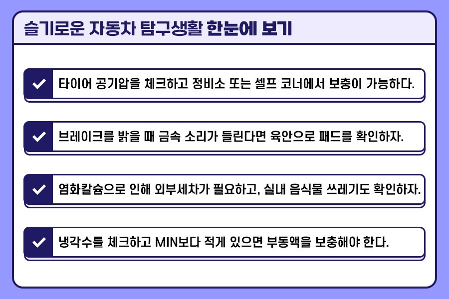 장거리 운전 시 필요 점검과 차량 용품을 소개해 드렸는데요. 슬기로운 자동차 탐구 생활을 통해 최신 트렌드와 이슈를 익히고 안전운전에 도움이 될 수 있도록 다양한 정보로 찾아뵙겠습니다.