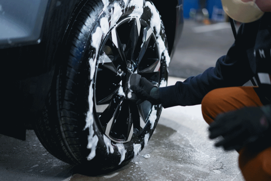 ⑤ 다 문질렀으면, 표면이 마르기 전 고압수로 깨끗하게 씻어주세요. 그럼 휠과 타이어의 세척은 깔끔하게 끝!입니다.