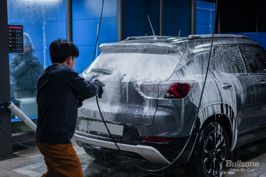 ① 차에 고압수를 뿌린 후 기본 오염물질을 제거해 주고, 폼건이나 카 샴푸를 사용하여 차를 닦아줍니다.