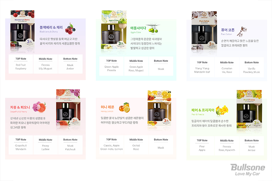고급 향수 같은 방향제, 그라스 디퓨저는 다양한 장소에서 모두 어울리는 디자인을 갖출 정도로 예쁜 자동차 방향제입니다. 불스원은 그라스 제품을 만들 때 프랑스산 에센셜 오일을 전문적으로 조향 한 품격 있는 향으로 제작했습니다. 500년 전통을 지닌 프랑스 향수의 낙원인 그라스, 조향사들의 고향이자 영혼과도 같은 도시를 포인트로, 깊고 풍부한 향취를 선보이는 방향제로 만들었습니다.