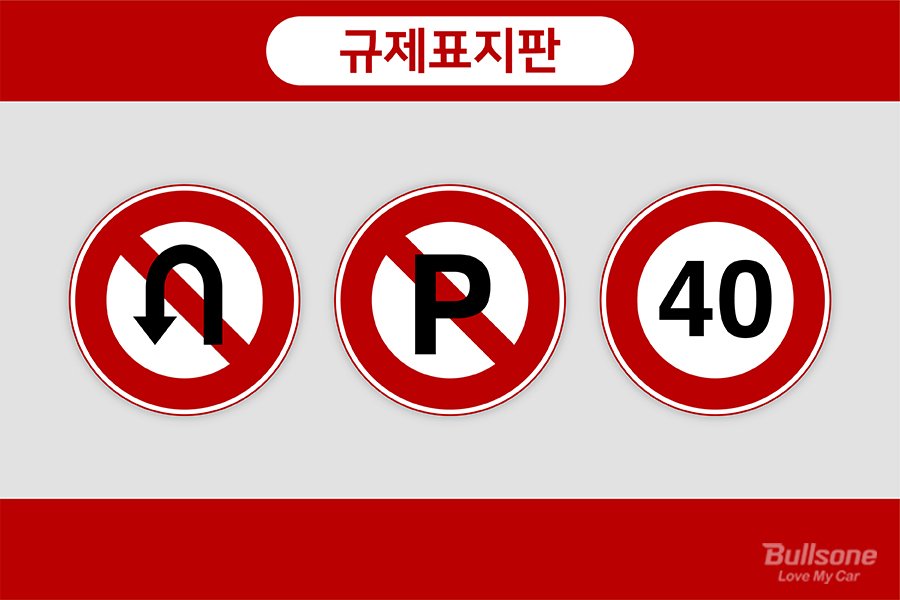 사진에 보이는 규제 표지판은 U턴 금지, 주차금지, 40km 이상 속도 금지 표지판입니다. 해당 구간에서 절대 하면 안 되는 내용들을 표시했습니다. 그리고 헷갈릴 수 있는 내용 중 하나가, 세 번째 표지판인데요. 만약 숫자 바로 밑에 ㅡ 모양으로 밑줄이 그어져 있다면 최저 속도를 뜻합니다.