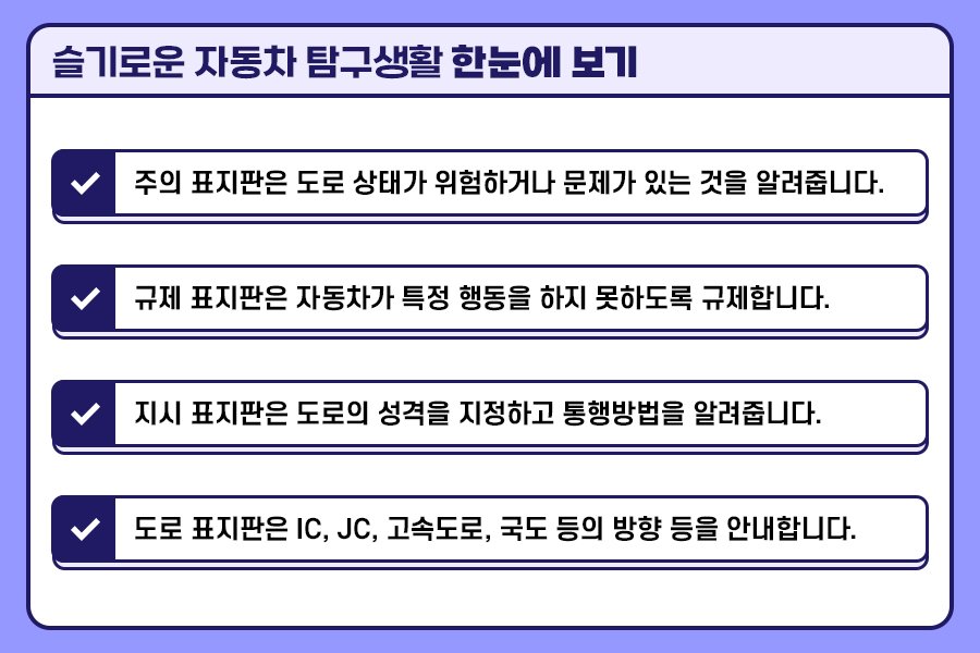 이번 시간은 표지판 내용과 주행을 위한 차량 용품을 소개해 드렸는데요. 슬기로운 자동차 탐구 생활을 통해 최신 트렌드와 이슈를 익히고 안전운전에 도움이 될 수 있도록 다양한 정보로 찾아뵙겠습니다.