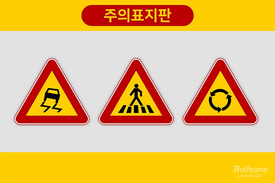 대표적으로 도로공사 현장에서부터, 교차로, 철길 건널목, 어린이 보호, 오르막 내리막, 과속방지턱 등 다양한 환경에서 운전자 및 보행자의 주의를 표시합니다. 해당 도로 사용자가 자신에게 필요한 안전조치를 스스로 할 수 있도록 주의 표시를 나타내고 있습니다.
