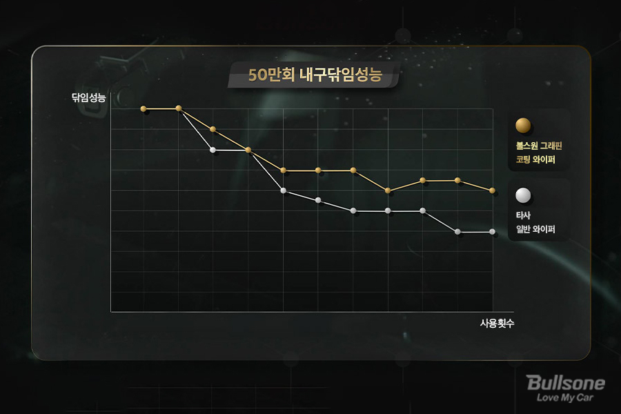그래핀 코팅을 통해 200시간 동안 연속으로 작동해도 코팅면이 균일하게 유지되는 성능을 보여줍니다. 때문에 한 번 교체만으로 50만 회를 사용할 정도로 장기간 안정되게 깨끗한 시야를 확보할 수 있어요. 특히 유리창과 와이퍼의 마찰이 감소되어 소음과 떨림 없이 부드럽게 닦이는 것이 장점입니다.