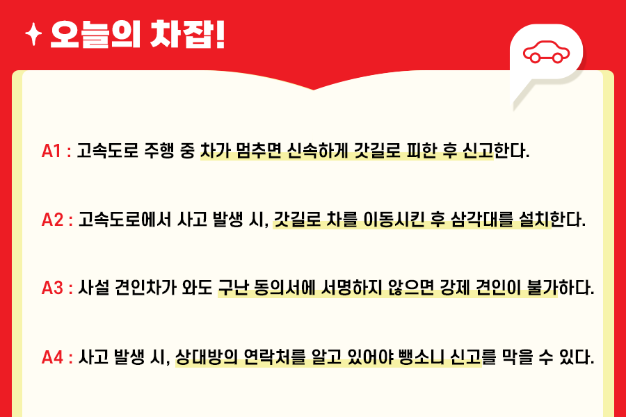 오늘은 고속도로를 주행하면서 안전운전 내용들에 대해 차문차답을 해보았는데요. 모든 질문 속에는 안전에 관한 이야기가 있으므로, 안전운전을 위해 필요한 내용입니다. 다음 주 역시 많은 분의 궁금증이 사라질 수 있도록 좋은 정보로 찾아뵙겠습니다!