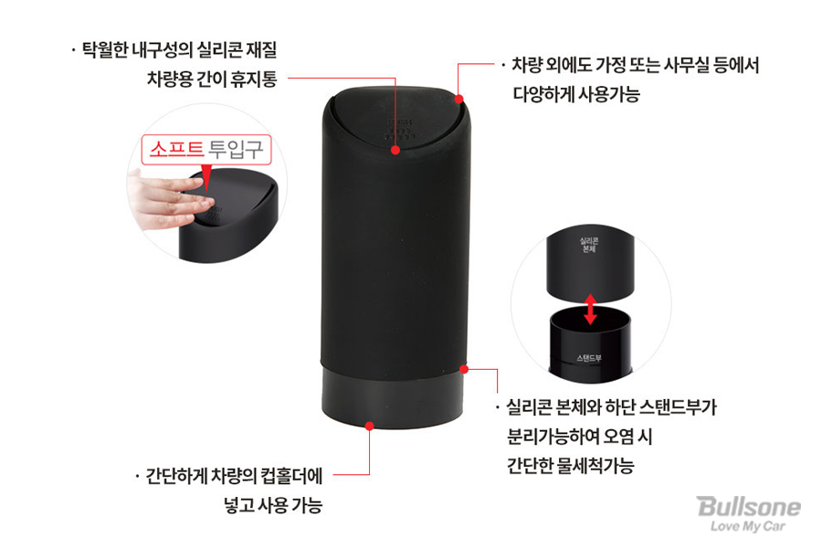 불스원 실리콘 차량용 휴지통은 부드러운 실리콘으로 제작되어 사용성도 편의하고 깔끔한 물세척도 가능합니다. 때문에 내구성이 좋아 오래 사용할 수 있는데요, 간단하게 차량의 컵홀더에 넣고 사용이 가능할 정도로 심플하고 모던한 디자인을 갖추고 있어요.