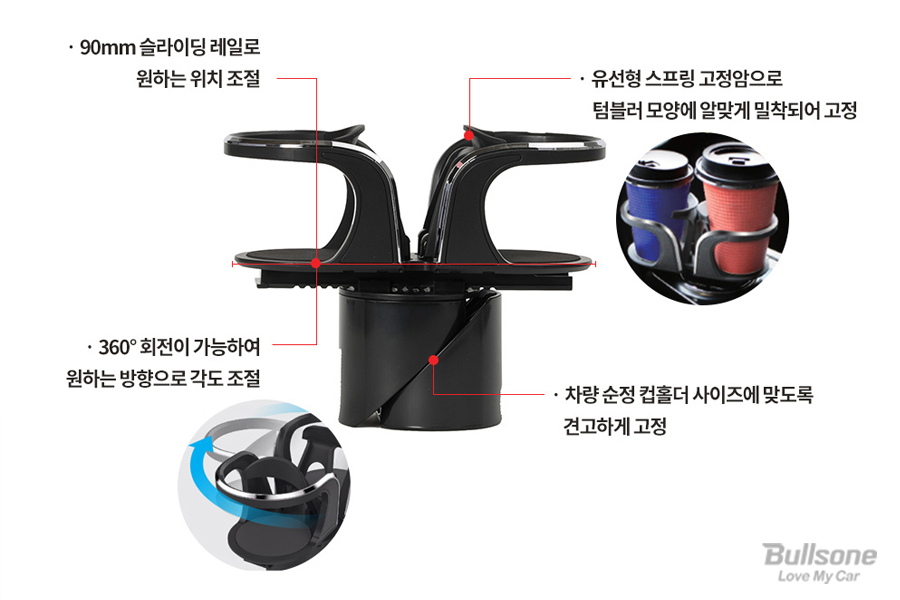 그런데 트윈 무빙 텀블러 컵홀더는 기존 1개의 자리를 2개로 확장시켜 줄 뿐만 아니라 90mm 슬라이딩 레일로 원하는 위치에 놓을 수 있도록 조절하기가 편합니다. 거기에 360도 회전이 가능하여, 실제 자동차 컵홀더 자리에 편한 위치로 고정할 때 사용이 편해요.
