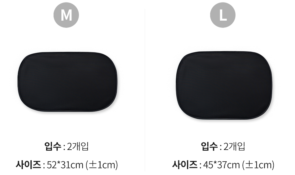2개씩 구성되어 넉넉하게 사용이 가능한 햇빛가리개의 사이즈는 직사각형으로 긴 모양의 M 모델과, 정사각형에 가까운 L 모델 두 가지로 나누어져 있습니다. 아무래도 창문 쪽에서 사용하실 분들은 M 사이즈를 추천드리고, 정면 앞유리 위주로 사용하실 분들은 L 사이즈를 추천드리는데요. 차량마다 사이즈는 다를 수 있으니, 사이즈 체크를 꼭 하시고 구매하시기를 추천드립니다.