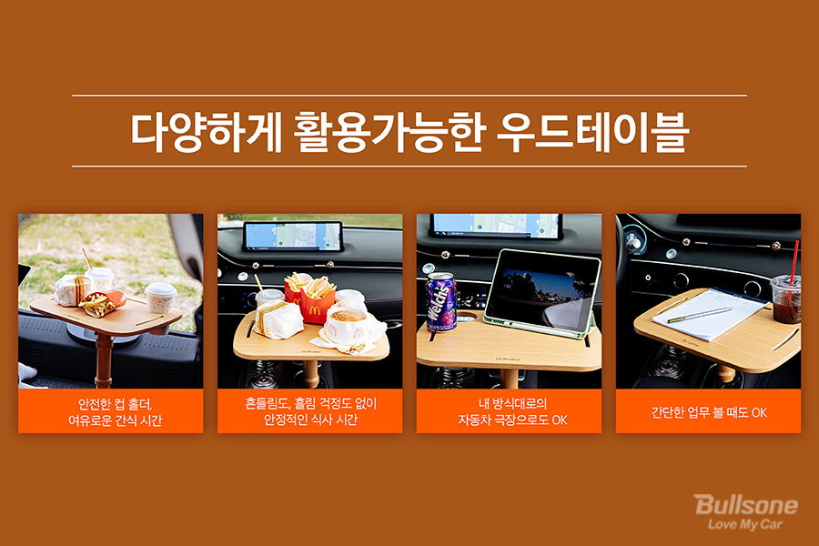 친절하게 높이조절이 가능하도록 연장바도 제공하며 브래킷 체결 구조로 내구성이 좋아, 여간해선 망가질 일도 없습니다. 봄여행이 조금 더 감성적으로 변하고, 차 안을 카페 같은 공간으로 만들고 싶다면 차량용 우드테이블! 가장 완벽한 봄여행과 봄데이트를 만들어 줄 겁니다.