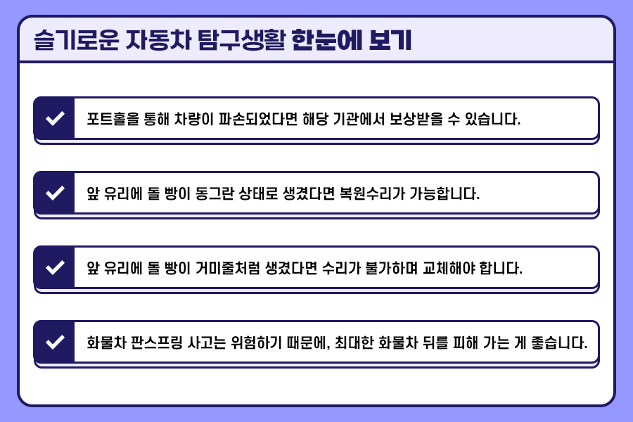 도로를 달리다 보면, 나는 아무 잘못을 하지 않았음에도 불구하고 대형 사고가 생기는 일이 발생합니다. 바로 포트홀, 돌, 판스프링 등을 통한 사고인데요. 이번 시간에는 왜 그런 사고가 나는지, 어떻게 대처해야 하는지에 대해 알아보도록 해요!