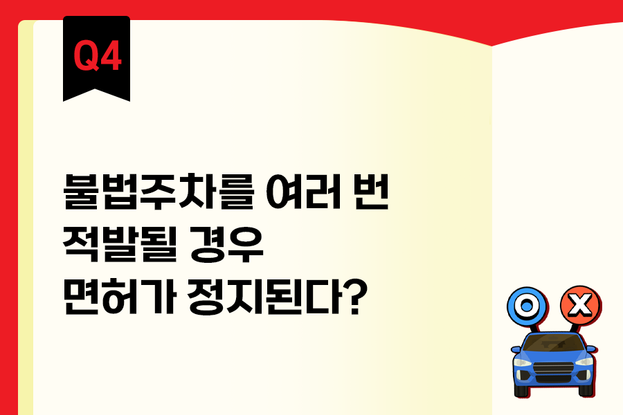 면허가 정지되기 위해서는 벌점이 쌓여야 합니다. 벌점이 40점 이상일 시 운전면허 정지 처분을 받게 되는데요, 불법주차로 인해 단속되는 경우에는 벌점이 있는 범칙금이 아닌, 벌점이 없는 과태료를 부과하게 됩니다. 때문에 불법주차가 여러 번 적발된다 하여도 면허가 정지되진 않습니다.