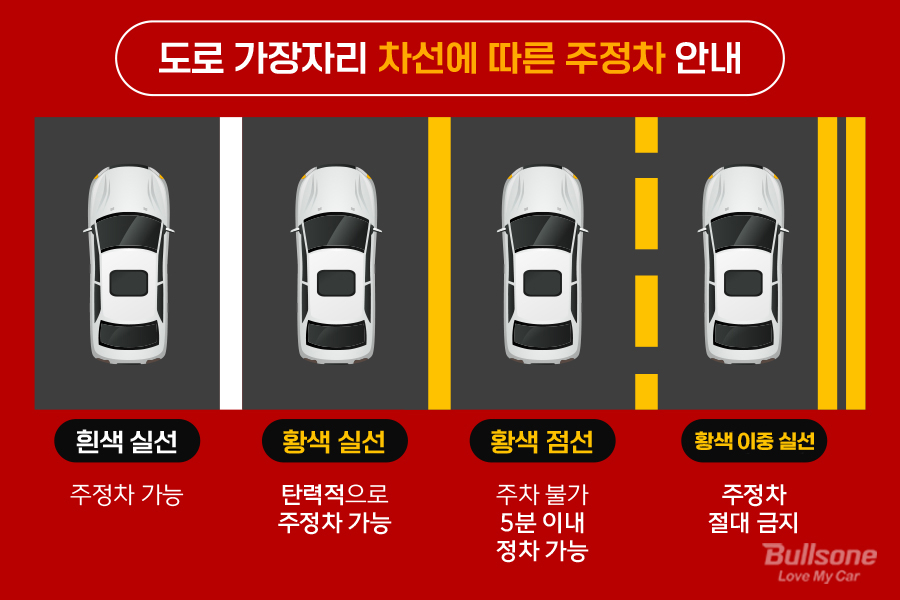 실선 자체가 도로에서는 차선 변경이 불가능하기 때문에 무의식적으로 정차가 불가능하다 많이 생각하는데요. 갓길 중에서 흰색만이 유일하게 주정차가 자유롭게 가능한 장소입니다.