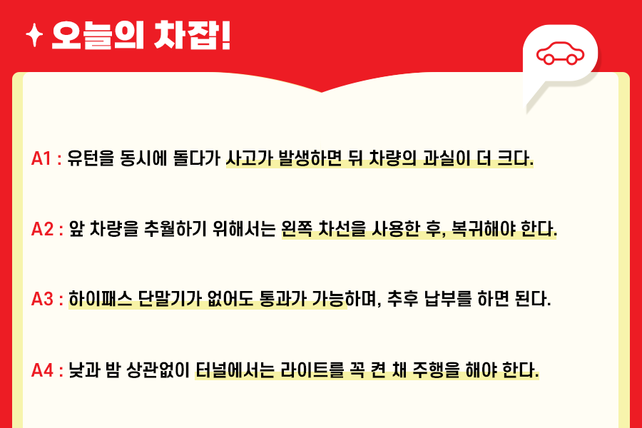오늘은 자동차를 주행하면서 안전운전 내용들에 대해 알쓸차잡을 해보았는데요. 모든 질문 속에는 안전에 관한 이야기가 있으므로, 안전운전을 위해 필요한 내용입니다. 다음 주 역시 많은 분의 궁금증이 사라질 수 있도록 좋은 정보로 찾아뵙겠습니다!