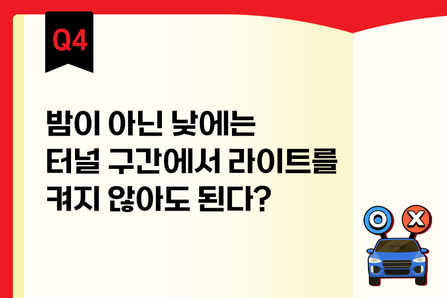낮이라고 방심하면 안 됩니다. 낮과 밤 상관없이 터널에서는 항상 라이트를 켜야 합니다. 터널은 밝은 조명이 설치되어 있다 해도, 미 점등 상태로 주행하게 되면 잘 보이지도 않을뿐더러 도로교통법 위반이 됩니다.