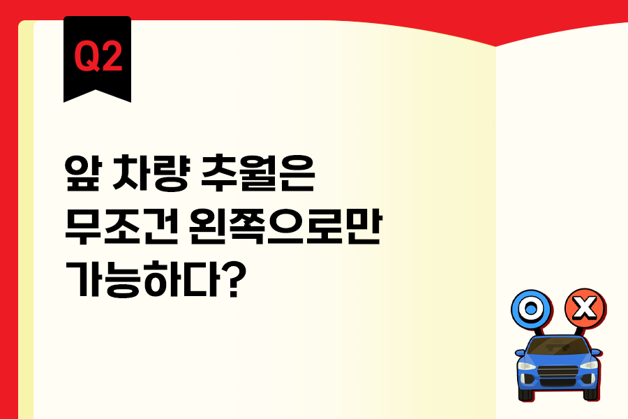 앞 차를 추월하기 위해 앞지르기를 할 때는 왼쪽으로만 가능합니다. 우리가 도로교통법 중에서 흔하게 실수할 수 있는 것 중 하나인데요. 차량을 앞지르다 보면 왼쪽뿐만 아니라 오른쪽으로 추월하는 경우도 많습니다.
