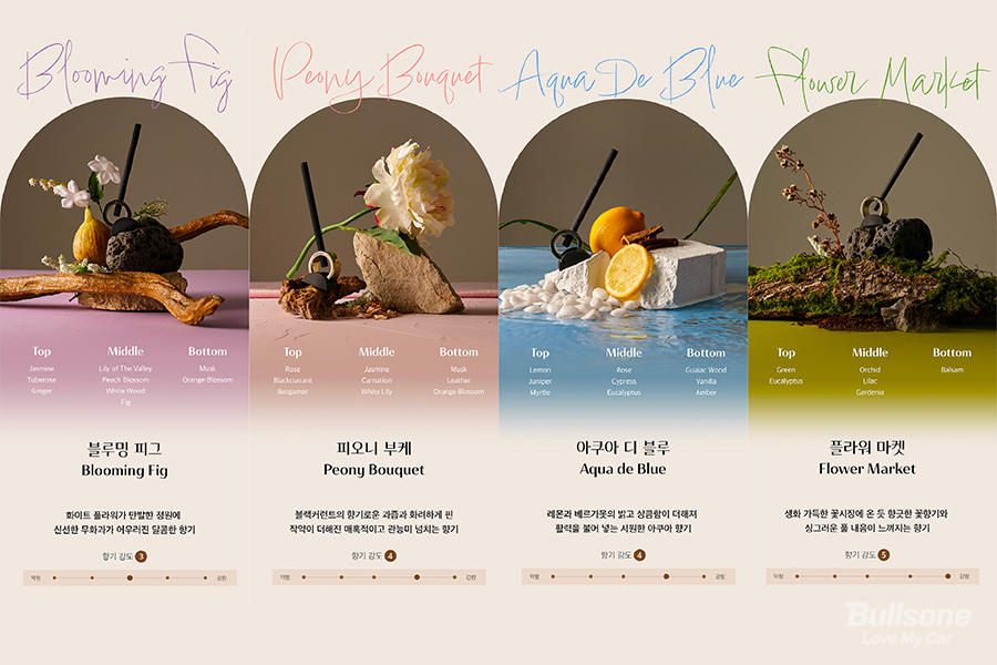 향기는 ①달콤한 향기 - 블루밍피그, ②매혹적인 과즙향의 - 피오니 부케, ③활력 있는 시원함 - 아쿠아 디 블루, ④싱그러운 꽃향기 - 플라워 마켓 이렇게 총 네 가지 구성으로 선택할 수 있습니다.