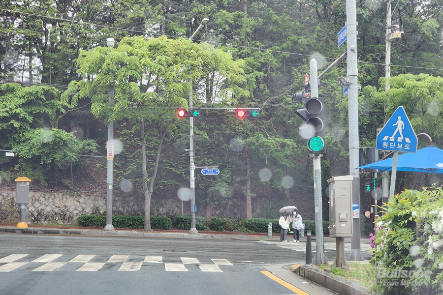 일단 우회전 신호등이 있는 곳이라면 이해하기 쉽습니다. 우회전 신호등이 설치된 곳에서는, 우회전 녹색 화살표 신호에 따라 진행하면 됩니다. 직진 방향 신호등과 상관없이, 오른쪽에 설치된 우회전 신호등을 바라보면 됩니다. 빨간 불이면 멈춰야 하고, 파란불일 때 천천히 서행하시면 됩니다.