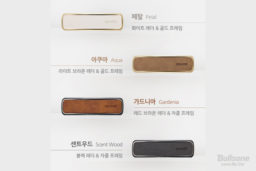 차에 대한 전문가, 불스원이 제안하는 프리미엄 한 공기케어는 바로 그라스입니다. 탑티어 향료 회사의 글로벌 향료로 에센셜 오일을 사용해 확실하게 호불호 없이 느껴지는 향 퍼포먼스가 뛰어납니다. 원료 그대로를 담으려는 노력으로 제품으로까지 구현이 정말 멋스러운데요. 레더스틱에는 그라스의 향이 네 가지가 담겼습니다.