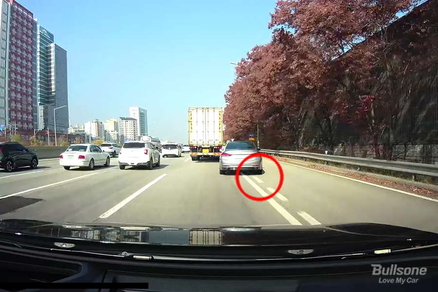 동그라미 표시된 차량은 1차선을 주행하고 있는데, 깜빡이를 켜지 않은 채 3차선까지 한 번에 차선 변경을 이어갔습니다. 급차선 변경이기도 하지만, 이렇게 차선을 사각지대에서 급하게 변경할 때에는 방향지시등을 꼭 키셔야 사고가 날 확률이 적습니다.