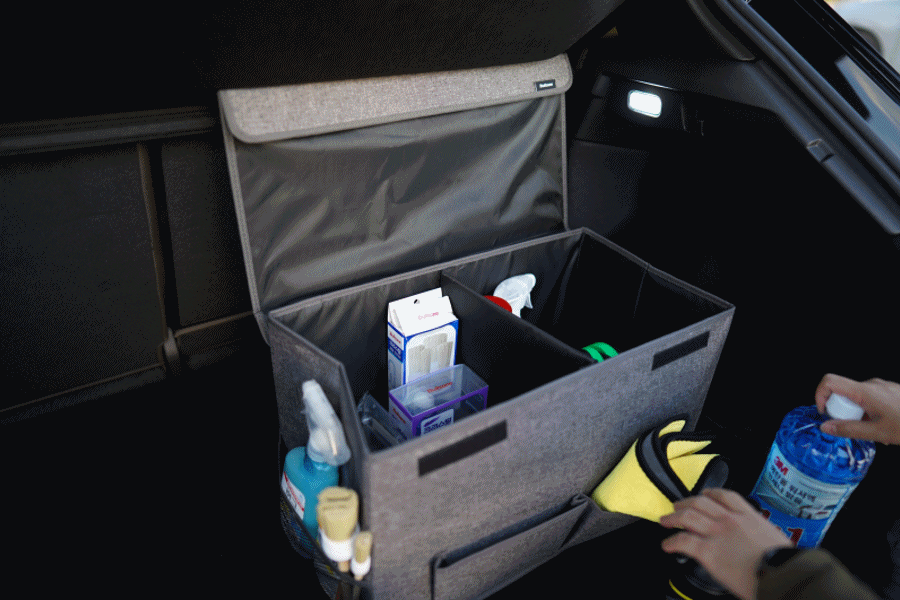 세차 용품부터 개인 필요 물건까지 한 번에 가득 담을 수 있어, 차를 굉장히 깨끗하게 정리 시켜주는 차량 용품입니다. 바닥면에는 흔들리지 않게 잘 고정할 수 있도록 벨크로가 있으며, 언제든 뚜껑부터 트렁크 정리함 자체를 분리할 수 있기 때문에 활용성이 굉장히 뛰어납니다.
