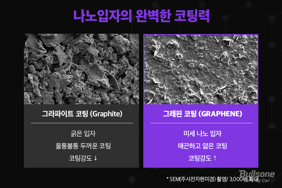기존 그라파이트 코팅을 사용했을 때는 입자가 두껍고, 울퉁불퉁한 코팅에 강도까지 약했다면, 그래핀 코팅은 미세 나노 입자로 매끈하고 얇은 코팅임에도 불구하고 강도는 훨씬 강합니다. 그래핀을 사용한다면 기존 와이퍼보다 훨씬 더 높은 성능의 우수한 기능을 갖출 수밖에 없습니다.