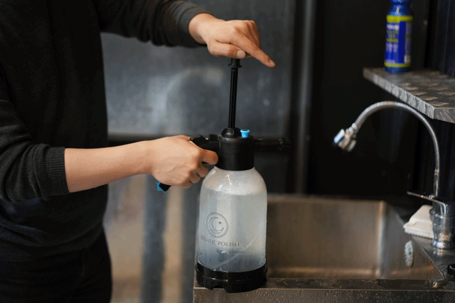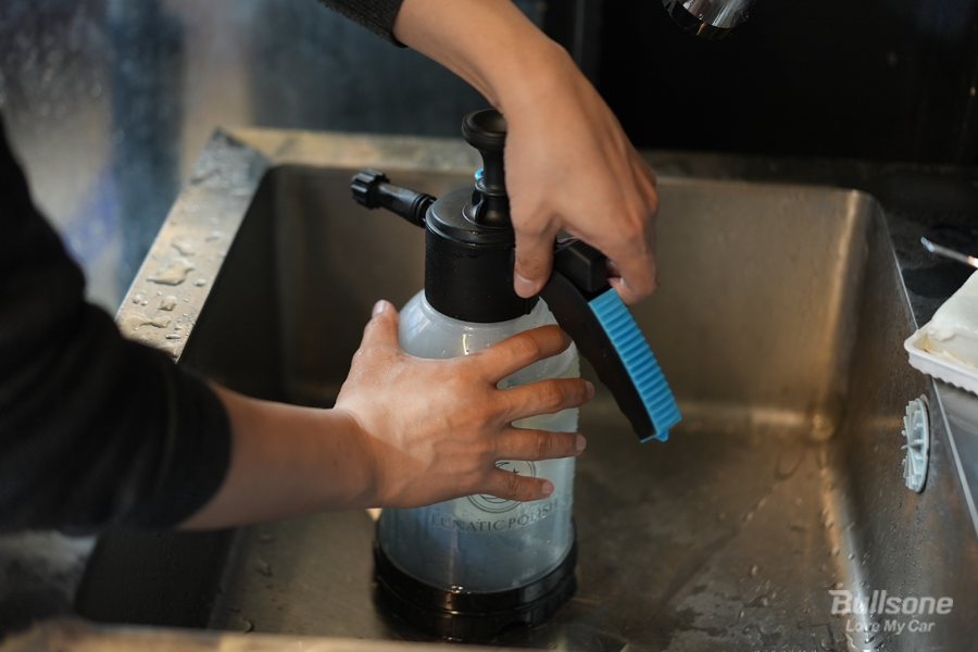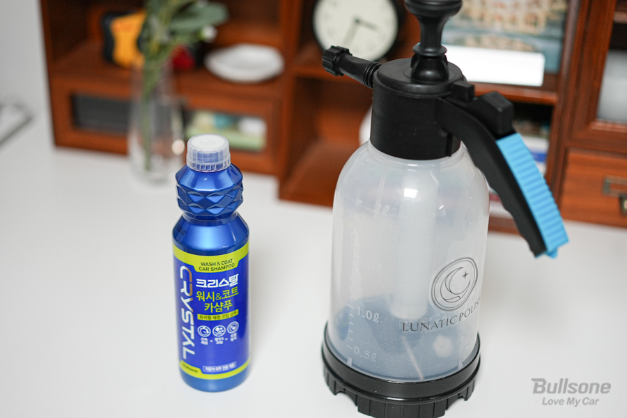 어떻게 세차를 할지 용도에 따라 제품 사용량을 조금 다르게 넣어서 희석하면 되는데요. 개인적인 스타일로 해도 되지만 권장 희석비율도 있기 때문에, 처음 사용하시는 분들은 희석비율을 참고하시면 됩니다. 저는 해당되는 압축분무기에 물 약 2L 정도를 받았습니다.