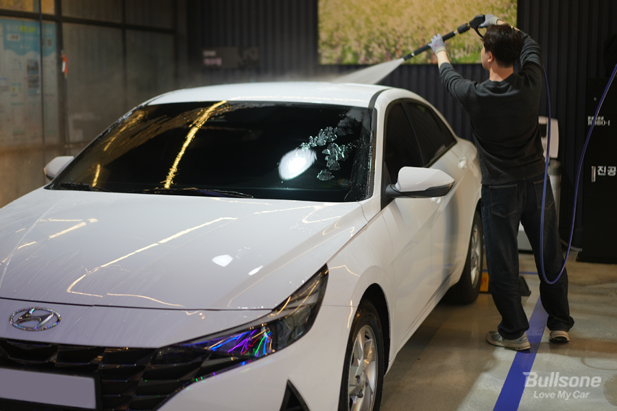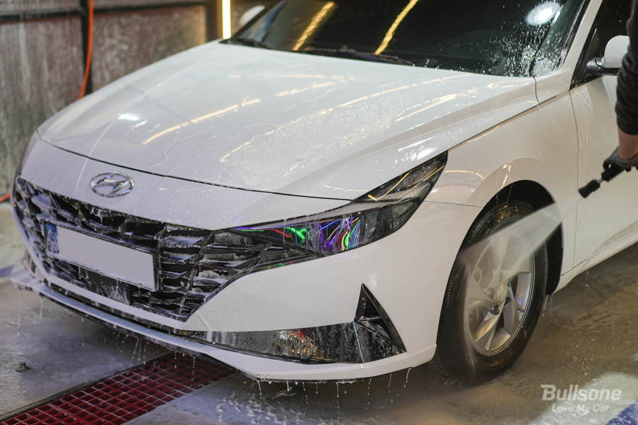 ④ 마지막으로 고압수를 뿌려 거품을 제거한 후 물기를 말끔하게 제거해 주면 세차 끝! 한 번의 작업으로 세정과, 발수, 방오력까지 얻어갈 수 있습니다.
