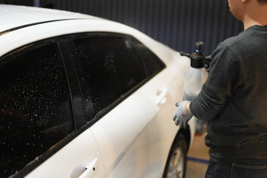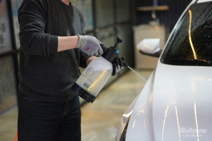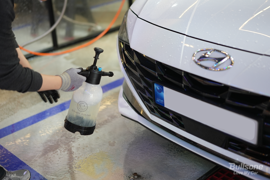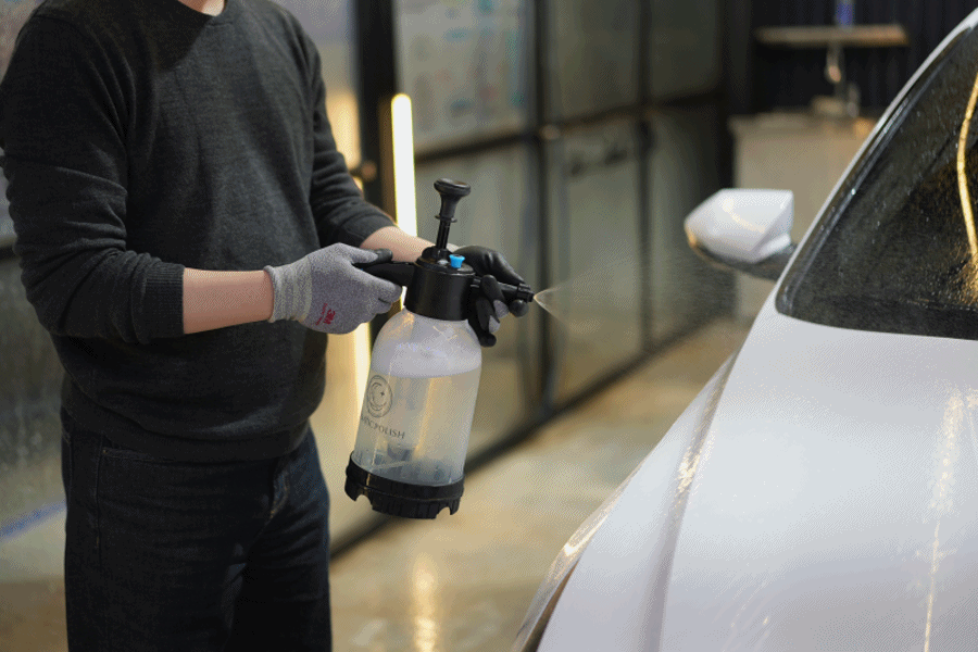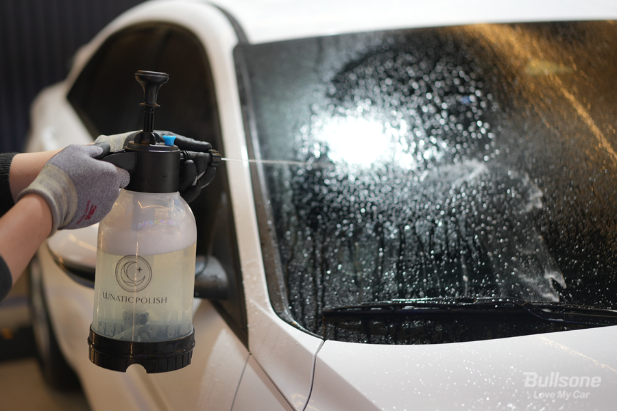 ② 앞 서 준비한 압축분무기를 통해 워시 앤 코트 카샴푸를 차체에 뿌려줍니다. 워시 앤 코트 카샴푸가 올인원이라고 불리는 또 하나의 이유는 자동차 외관 모두에 사용이 가능하다는 장점을 가지고 있습니다. 도장면은 물론, 유리와 플라스틱 등 부담 없이 어떤 곳이든 풍부하게 뿌려주세요.