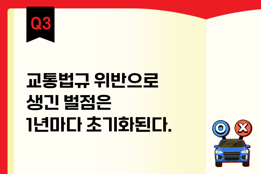 법규 위반 또는 교통사고로 인한 벌점은 행정처분 기준을 적용하려는 해당 위반 또는 사고가 있었던 날을 기준으로 3년간의 모든 벌점을 누산 하여 관리됩니다. 때문에 내가 벌점을 받는 날을 기준으로 3년이 지나면 하나씩 벌점이 사라진다고 생각하시면 됩니다.