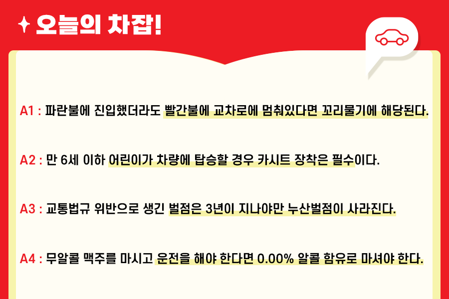 오늘은 주행하면서 안전운전 내용들에 대해 궁금했던 알쓸차잡을 해보았는데요. 모든 질문 속에는 안전에 관한 이야기가 있으므로, 안전운전을 위해 필요한 내용입니다. 다음 주 역시 많은 분의 궁금증이 사라질 수 있도록 좋은 정보로 찾아뵙겠습니다!