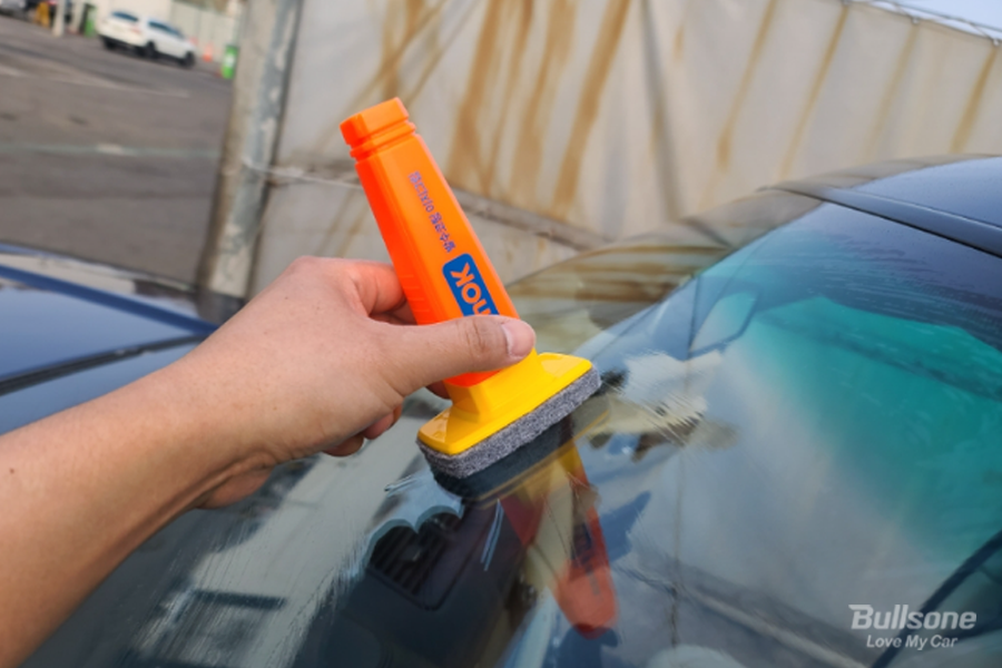 직접 차량 앞 유리에 원형을 그리며 유막을 제거하셨습니다. 손에 묻지 않고 잘 바른 후, 물로 깨끗하게 씻어 내고 나니 정말 깨끗하게 차량 앞유리가 변했습니다. 유막제거는 찌든 물 때를 제거해 깨끗한 시야 확보를 해줍니다.