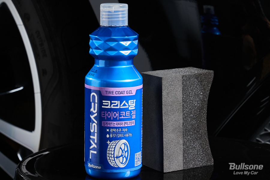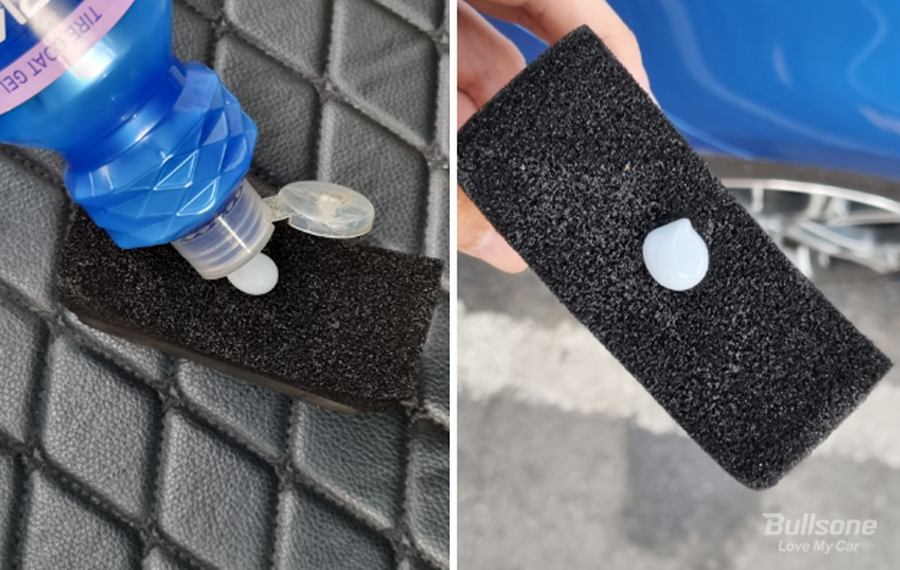 타이어 코트 젤은 스펀지에 제품을 짜고 난 후 타이어에 발라주기만 하면 광이 제대로 살아납니다. 광택이 6주나 지속되고, 물기가 있어도 사용이 가능하다는 것이 가장 큰 장점이에요.