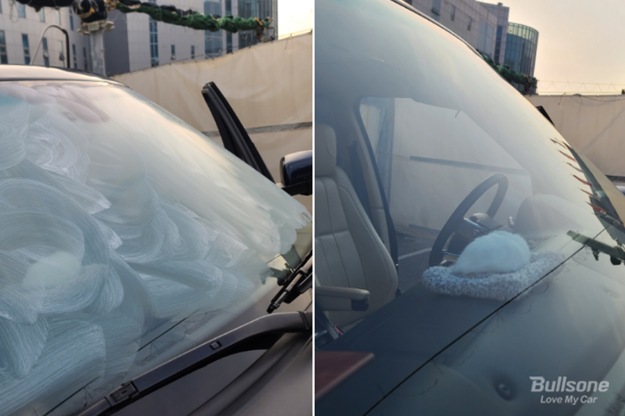 직접 차량 앞 유리에 원형을 그리며 유막을 제거하셨습니다. 손에 묻지 않고 잘 바른 후, 물로 깨끗하게 씻어 내고 나니 정말 깨끗하게 차량 앞유리가 변했습니다. 유막제거는 찌든 물 때를 제거해 깨끗한 시야 확보를 해줍니다.
