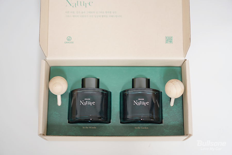 그라스 네이처의 제품 구성은 본품 2개와 친환경 기프트 박스로 구성되어 있습니다. 제품에는 인더우드 향과 인더가든 향 두 가지로 나뉘어서 제품이 들어있는데요. 한 제품 구매로 두 가지의 향을 모두 느껴볼 수 있어서 좋기도 하고, 최근에는 한 가정에 차를 두대 이상 보유하고 있는 분들이 많아서, 2개의 제품 구성은 딱! 어울리는 선물 구성입니다.