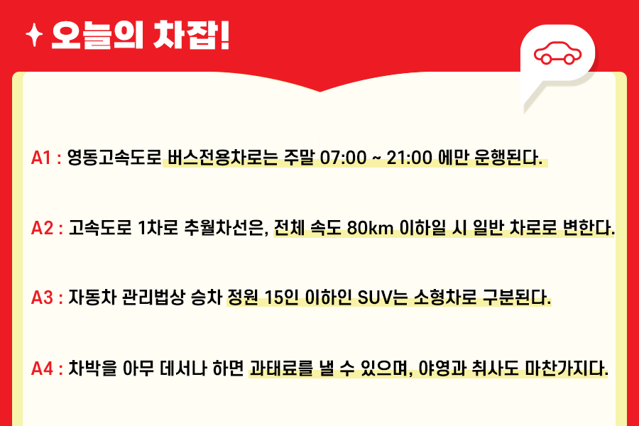 오늘은 여름휴가 운전 시 도로교통법 내용들에 대해 궁금했던 알쓸차잡을 해보았는데요. 모든 질문 속에는 안전에 관한 이야기가 있으므로, 안전운전을 위해 필요한 내용입니다. 다음 주 역시 많은 분의 궁금증이 사라질 수 있도록 좋은 정보로 찾아뵙겠습니다!