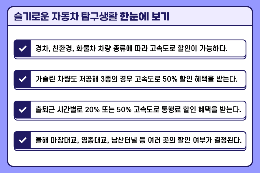 한 달로 계산해 보면 굉장히 부담스러운 비용인데요, 고속도로는 차종이나 통행 시간에 따라 할인을 받을 수 있는 여러 가지 경우가 많기 때문에, 이에 해당이 된다면 꼭 챙기는 것이 좋습니다.