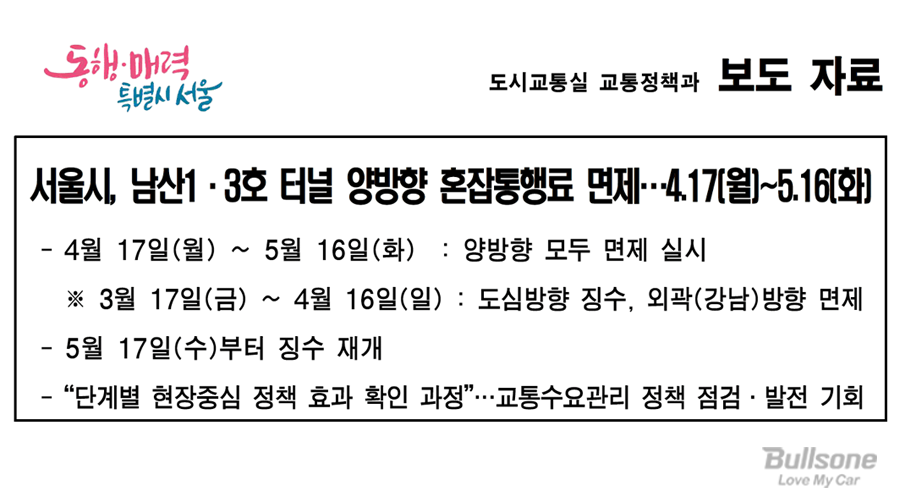 이번 두 달 기간을 통해 교통량과 통행속도 변화를 분석하여 6월 중 내용을 발표할 예정이며, 이를 토대로 남산 터널의 혼잡통행료 징수 여부를 결정할 예정이라 합니다.