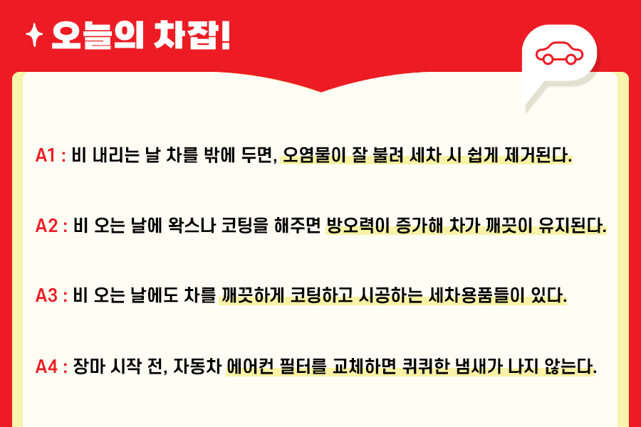 오늘은 비 오는 날 세차에 관련된 내용들에 대해 궁금했던 알쓸차잡을 해보았는데요. 모든 질문 속에는 안전에 관한 이야기가 있으므로, 안전운전을 위해 필요한 내용입니다. 다음 주 역시 많은 분의 궁금증이 사라질 수 있도록 좋은 정보로 찾아뵙겠습니다!