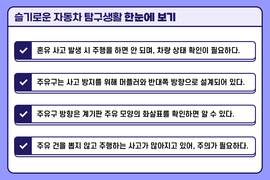 한 주의 자동차 주유 이슈와 핫한 차량 용품을 소개해 드렸는데요. 슬기로운 자동차 탐구 생활을 통해 최신 트렌드와 이슈를 익히고 안전운전에 도움이 될 수 있도록 다양한 정보로 찾아뵙겠습니다.