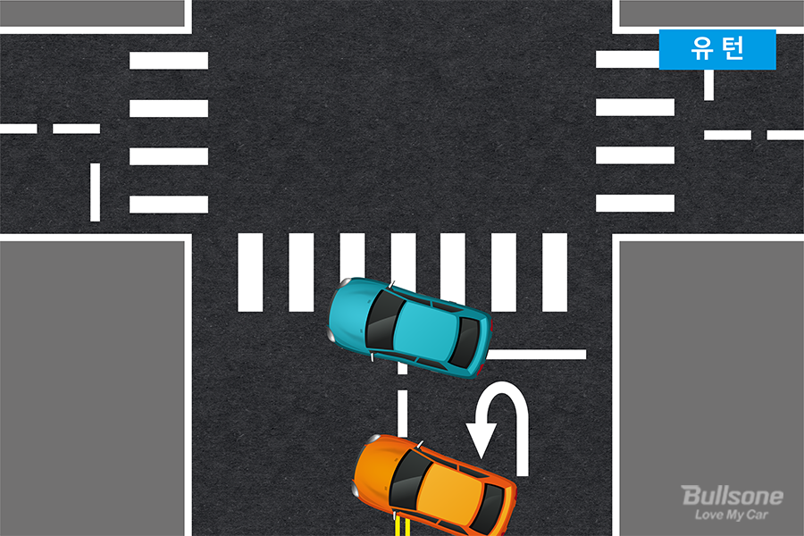 사고가 잘 발생하는 상황 중 하나가 바로 U턴하는 순간에 우회전차량과 만나 충돌하는 사고입니다. 일반적으로 U턴을 하게 되면 끝차선까지 돌아야 하기 때문에, 우회전하는 차량들과 접촉할 수 있는 상황이 많아집니다. 하지만 신호를 기준으로 보았을 시 비보호 우회전보다 신호가 있는 U턴 차량에게 우선권이 있습니다. 때문에 U턴을 하는 순간에는 우회전 차량이 멈추어야 합니다.