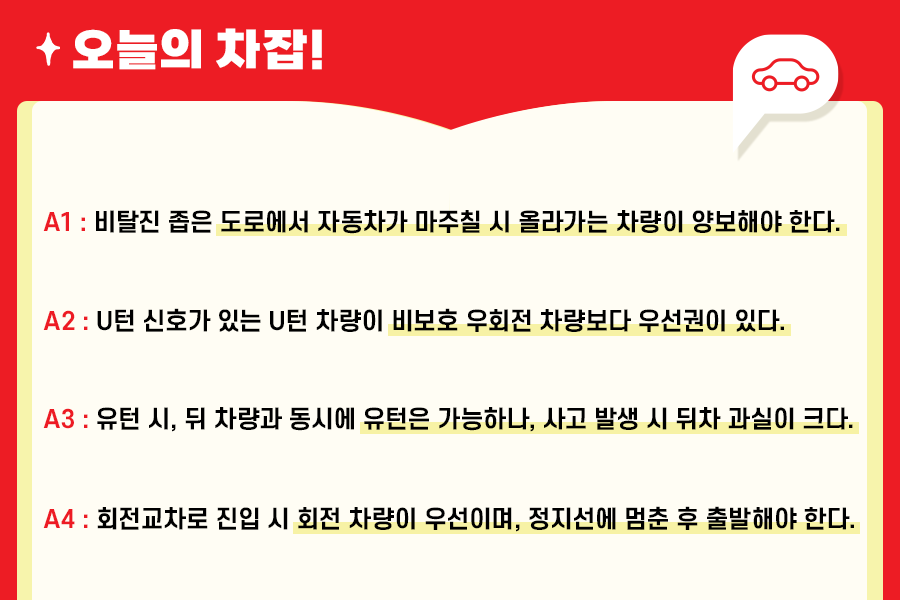 오늘은 우선권에 대한 안전운전 내용들에 대해 차문차답을 해보았는데요. 모든 질문 속에는 안전에 관한 이야기가 있으므로, 안전운전을 위해 필요한 내용입니다. 다음 주 역시 많은 분의 궁금증이 사라질 수 있도록 좋은 정보로 찾아뵙겠습니다!