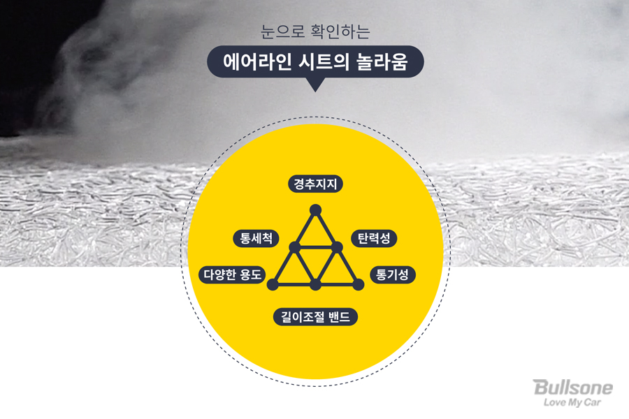 에어라인 방석시트는 쿠션 위에서 달걀을 튕겨도 깨지지 않으며, 쿠션을 올려놓고 사람이 위로 올라가도 달걀이 멀쩡할 정도로 탄력성이 좋고, 아래 호수를 깔아도 제대로 물이 통과할 정도로 높은 탄력성을 자랑합니다.