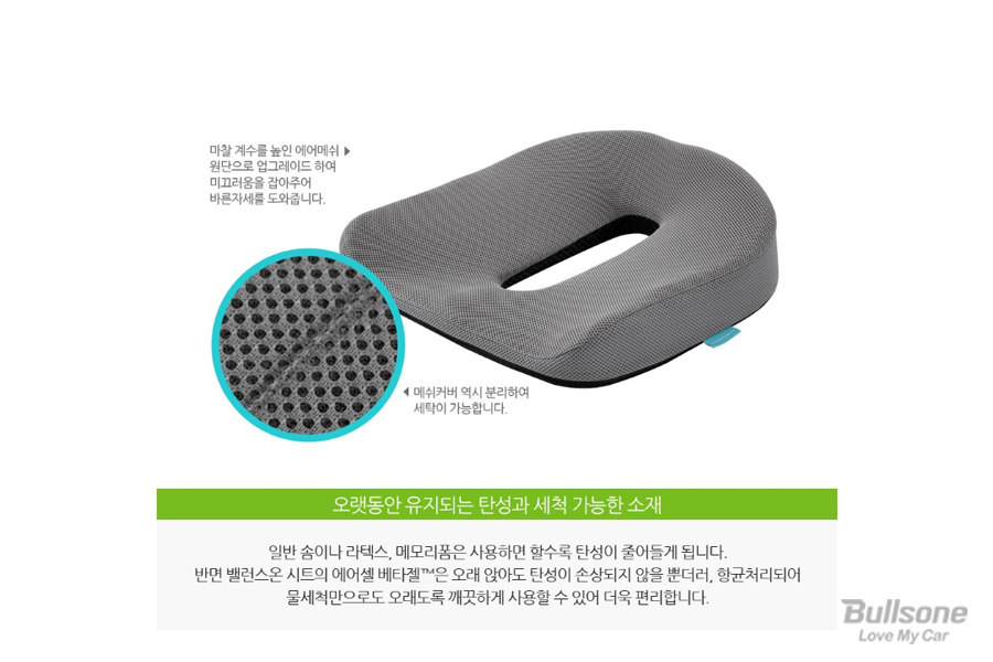 뿐만 아니라 통기성이 좋아, 장시간 이용해도 땀이 잘 차지 않으며, 논슬립 마감을 통해 시트가 미끄러지지 않도록 잘 지탱해 줍니다. 무엇보다 물세척으로 클린 하게 관리가 가능해 사용편의성까지 잡았습니다.