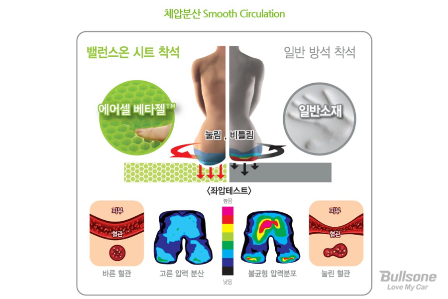 일반 소재보다 훨씬 뛰어난 세계 특허 출원 2중 허니콤 테크놀로지와 에어셀 베타젤 소재는 골반 교정을 도와주며, 혈관을 눌리지 않게 해 엉덩이부터 골반까지 압력을 고르게 분산시켜 줍니다.