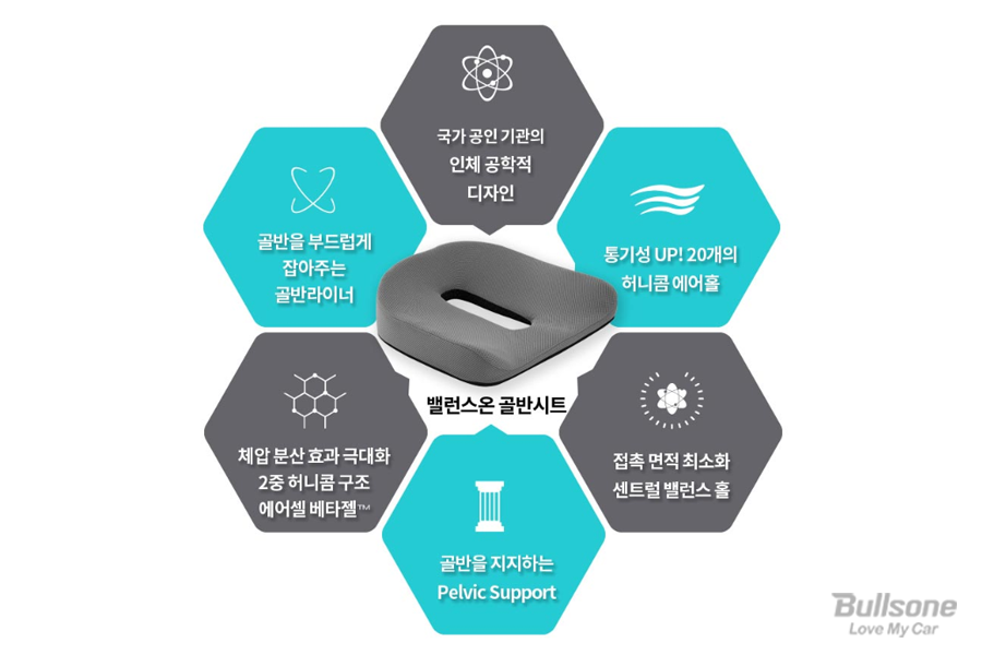 밸런스온 자세교정 골반시트는 ①20개의 허니콤 에어홀을 통해 통기성이 굉장히 좋고, ②골반라이너 디자인으로 골반을 부드럽게 잡아줍니다. 뿐만 아니라 ③2중 허니콤 구조 에어셀 베타젤을 통해 체압 분산 효과를 극대화시켰으며 접촉 면적을 최소화시키는 센트럴 밸런스 홀까지 만들어져 있습니다.