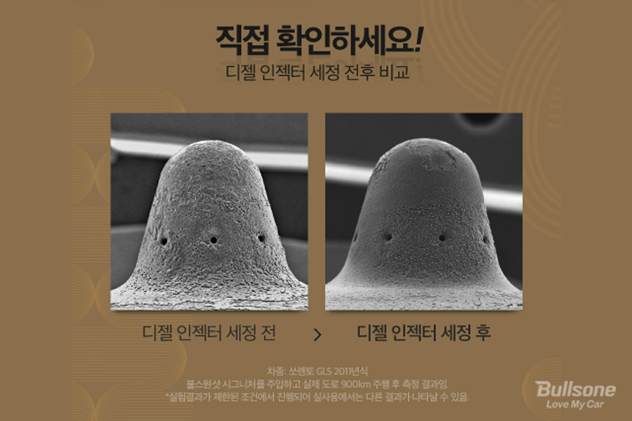 디젤 차량의 불스원샷 사용 전과 후의 비교입니다. 해당 차량은 쏘렌토 11년식이고 불스원샷 시그니처를 주입한 후 도로를 900km 주행 후 측정한 결과입니다. 확실히 카본 때가 제거되어 있는 것을 눈으로 확인할 수 있습니다.