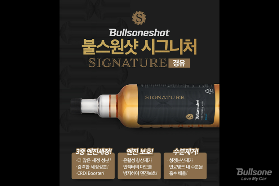 불스원샷 시그니처는 ① 늘어난 청정분산제를 통해 더 많은 세정 성분을 함유해서 카본 때를 강력하게 제거해 줍니다. 그리고 ② 고열에 강한 세정성분이 뜨거운 엔진 내부 속에서도 카본 때를 효과적으로 제거해 주는 진보된 세정 성분이 들어 있습니다. ③ 더 적합한 세정성분 부스터 첨가로 엔진을 빠르고 강력하게 세정하여 출력을 복원시켜 주기 때문에, 지금 차량관리에 딱 필요한 용품은 불스원샷 시그니처입니다.