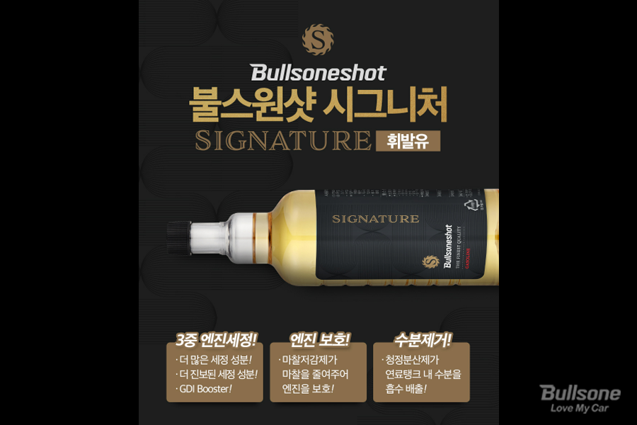 불스원샷 시그니처는 ① 늘어난 청정분산제를 통해 더 많은 세정 성분을 함유해서 카본 때를 강력하게 제거해 줍니다. 그리고 ② 고열에 강한 세정성분이 뜨거운 엔진 내부 속에서도 카본 때를 효과적으로 제거해 주는 진보된 세정 성분이 들어 있습니다. ③ 더 적합한 세정성분 부스터 첨가로 엔진을 빠르고 강력하게 세정하여 출력을 복원시켜 주기 때문에, 지금 차량관리에 딱 필요한 용품은 불스원샷 시그니처입니다.