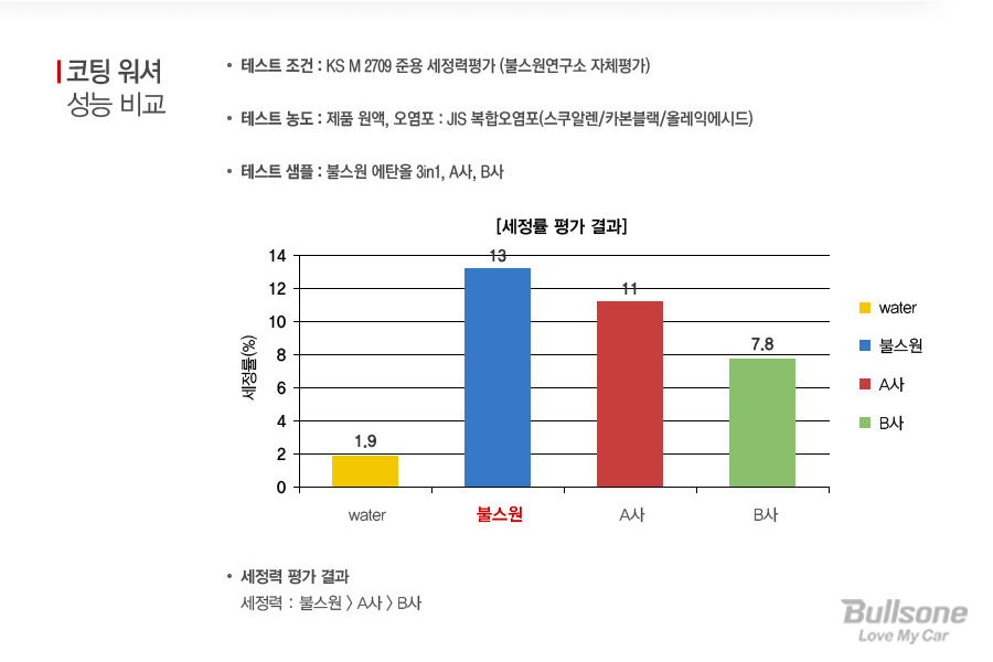 발수코팅의 효과까지 들어가면 기존 세정 효과가 더 떨어지는 것 아닌가 걱정을 하시는 분들도 계시지만, 불스원 자체 평가를 했을 때 타사보다 세정률이 훨씬 높다는 것을 알 수 있습니다.